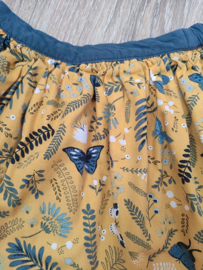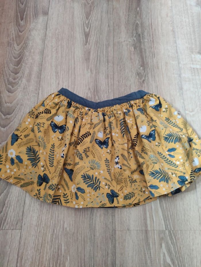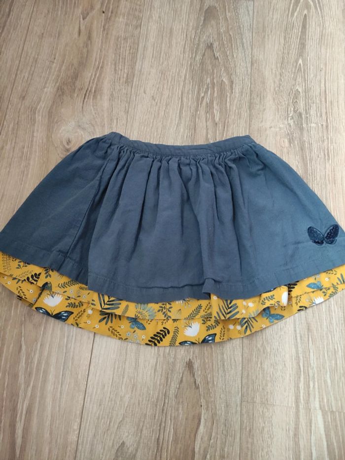 Jupe 5 ans. Vertbaudet. Un côté jaune avec papillons et l'autre gris bleus avec bas jaune papillons