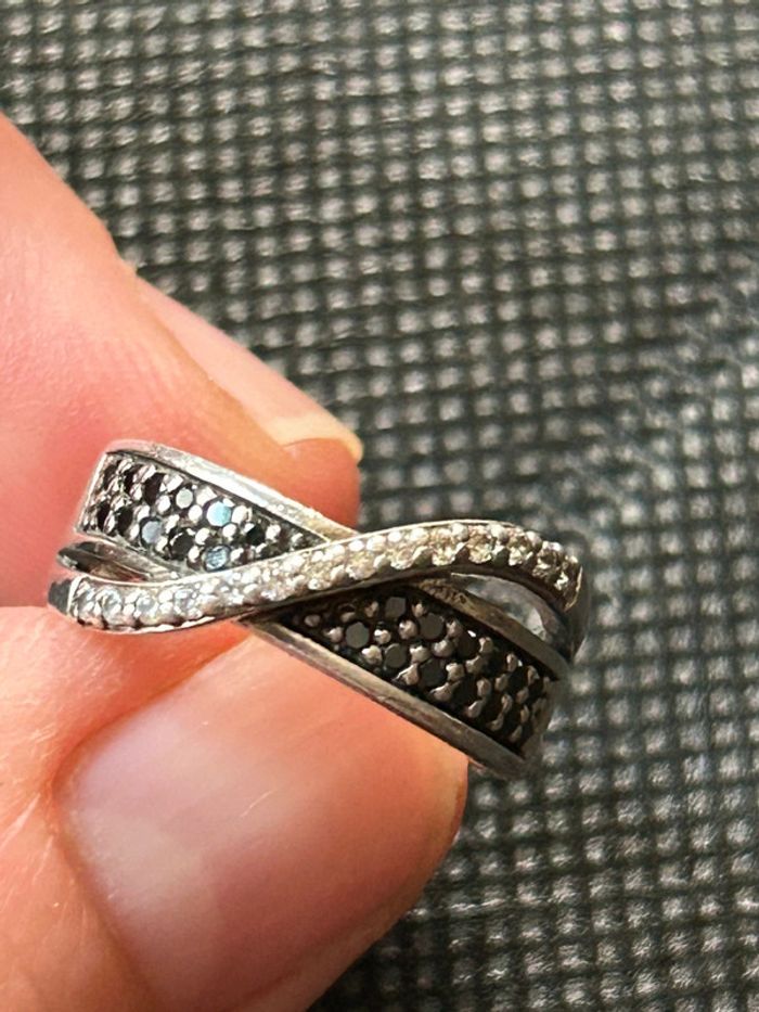 Jolie bague en argent massif avec pierres noires et blanches T. 50 femme TBE - photo numéro 1