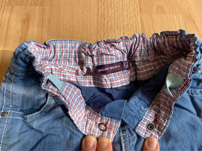 Beau pantalon/jean bleu de marque SERGENT MAJOR pour bébé garçon T. 12 mois/74 cm, en coton entièrement doublé en coton. Taille elastiquée et réglable grâce à deux petits élastiques de chaque côté, fermeture par bouton, 4 poches.