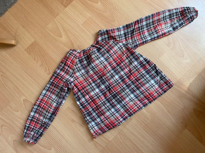 Joli T-shirt ou tunique à carreaux oranges, blancs et marrons, à manches longues, de marque OKAÏDI, pour fille T. 4 ans/102 cm, en coton, en très bon état. Encolure ronde, fermeture par boutons devant, finitions avec des plus « couture ».