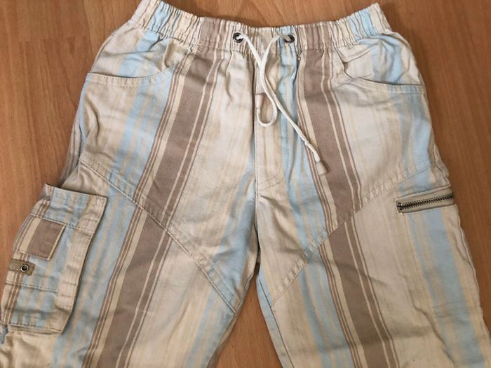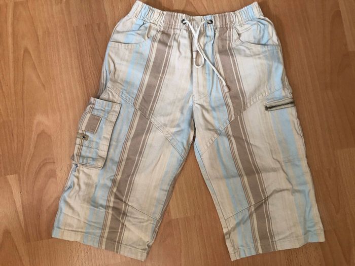 Joli short long beige à rayures bleues, de marque ORCHESTRA pour garçon T. 4 ans/104 cm, en coton, en très bon état. 6 poches, taille entièrement elastiquée, cordons à nouer devant. #merine103 #merine103vetementenfant #merine103vetementgarcon #orchestra #4ans