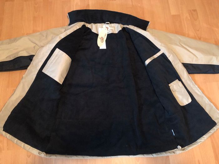 Belle parka beige et bleu marine, bien chaude doublée en polaire, pour homme T. XXL (6), en polyester enduit PVC, intérieur polyester (polaire), neuve avec étiquette. Fermeture par zip, col montant, deux poches extérieures et deux poches intérieures, cordons de resserrage sur le bas, petite capuche rangée dans le col. #merine103 #merine103vetementhomme #merine103vetementhommexxl
