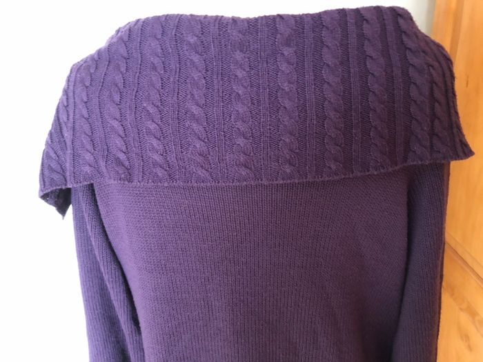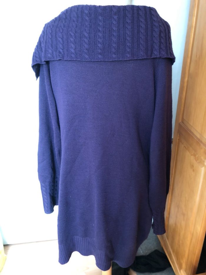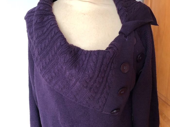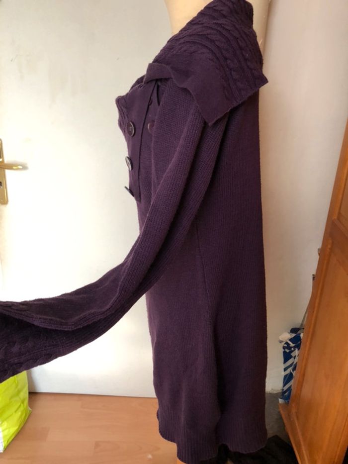 Jolie robe courte et chaude à manches longues, violette, pour femme T. 42/44, en laine acrylique, en bon état. Grand col ouvert sur le côté et retombant sur les épaules, finitions avec des mailles torsadé. Souvent portée mais peut aisément avoir une seconde vie. Idéale pour la saison hivernale. #merine103 #merine103vetementfemme #merine103vetementfemme42 #merine103vetementfemme44