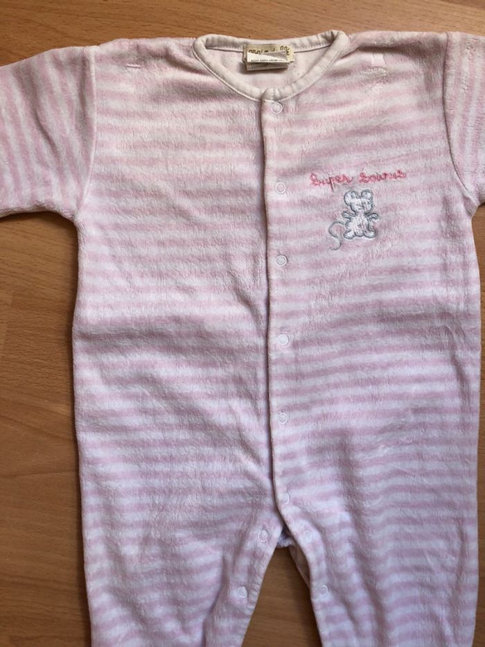 Beau pyjama en velours à rayures roses et blanches, de marque GRAIN DE BLÉ, pour bébé fille T. 6 mois/67 cm, en coton et polyester, en très bon état. Fermeture par boutons devant et sur l’entrejambe pour faciliter l’enfilage. #merine103 #merine103vetementbebe #merine103vetementfille