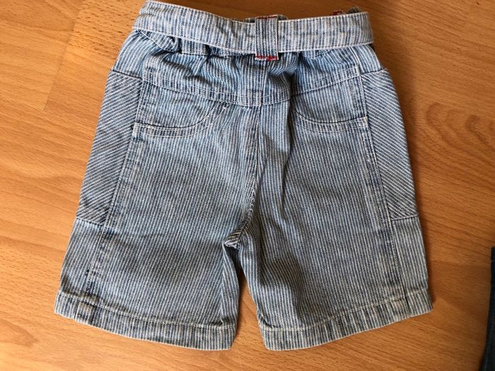Joli petit short en jean bleu à rayures blanches, avec sa petite ceinture assortie, de marque TAPE À L’ŒIL pour bébé garçon T. 18 mois, en coton, en très bon état. Fermeture par bouton, taille réglable par deux petits élastiques de chaque côté, ne serre pas trop le petit ventre de bébé. #merine103 #merine103vetementbebe #merine103vetementgarcon