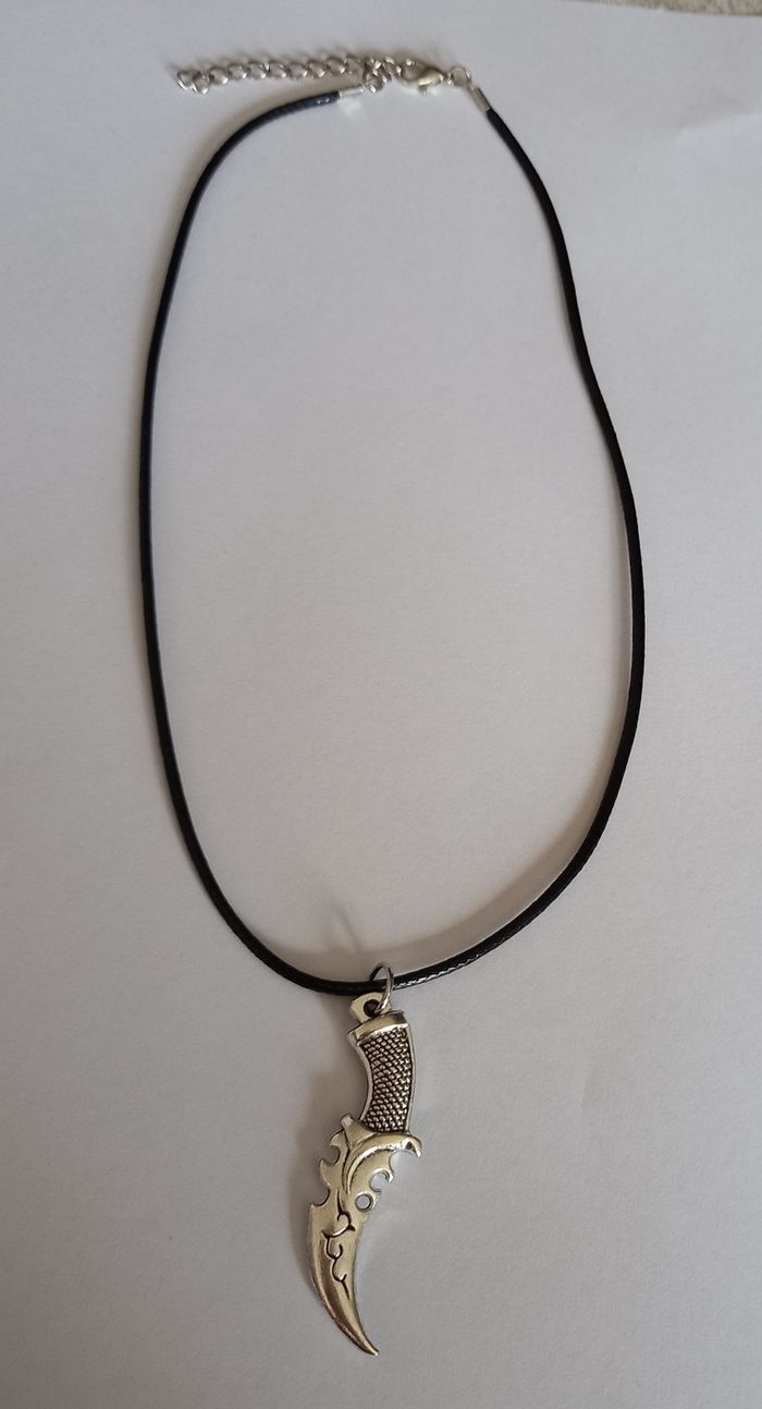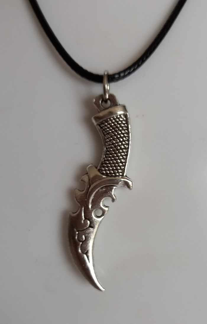 Collier dague celtique coloris argenté. Cordelette coloris noir de 42 cms. Dimensions du pendentif : 5x1 cms. Neuf sous blister. Envoi rapide et soigné.