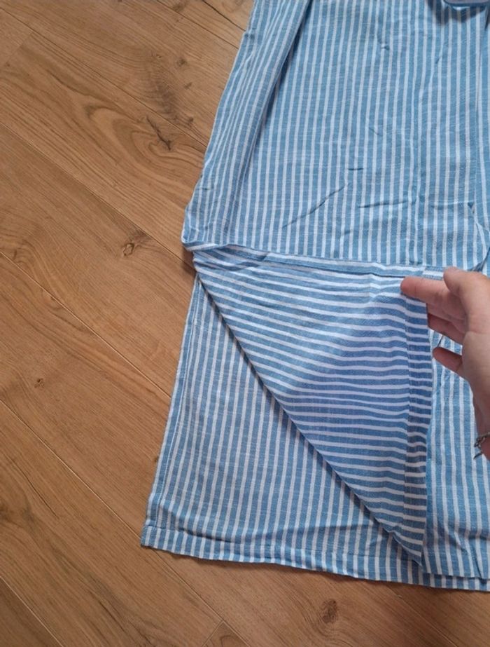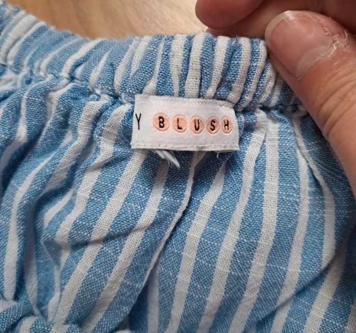 Robe longue rayures bleues épaules dénudées Volant broderie anglaise et petite ceinture Étiquette coupée, correspond à une taille 40
