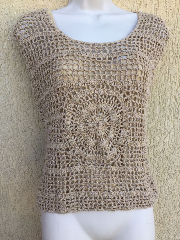 Haut beige ajouré avec débardeur beige intégré.