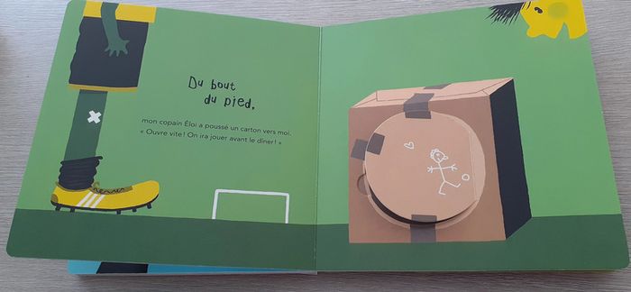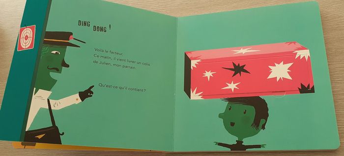 En bon état, peu servi Mais qu'y a-t-il dans ce paquet ? C'est la question que se pose l'enfant à chaque double page. Défilent tour à tour les parents, le facteur, la mamie, le grand-père, Capucine la voisine, l'oncle d'Amérique, le copain Eloi, et enfin le grand-frère. Chacun apporte un cadeau original, attendu, ou loufoque, à l'image de sa personnalité. des indices visuels et un jeu typographique accompagnent l'enfant dans sa recherche. Il ne lui reste plus qu'à ouvrir les paquets et découvrir les cadeaux sous le fenêtres.