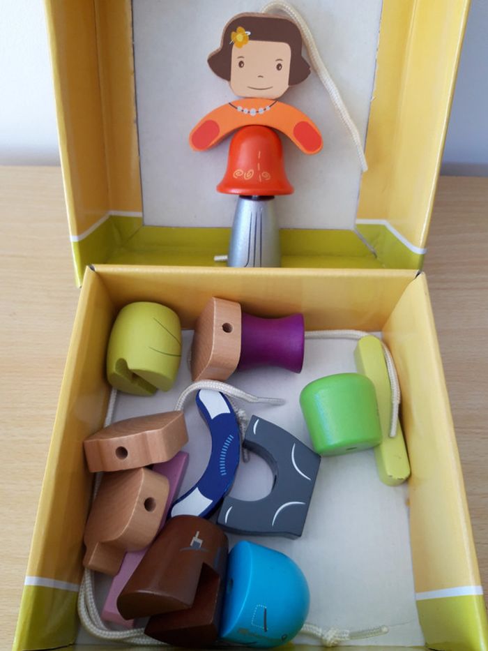 Petits personnages à monter, démonter, remonter. plusieurs combinaisons possibles de personnage avec une corde pour enfiler les pièces. 4 têtes, 4 paires de bras, 4 hauts, 4 bas, 4 petites cordes. La boite a quelques marques, vu à l'image