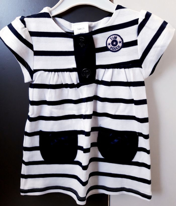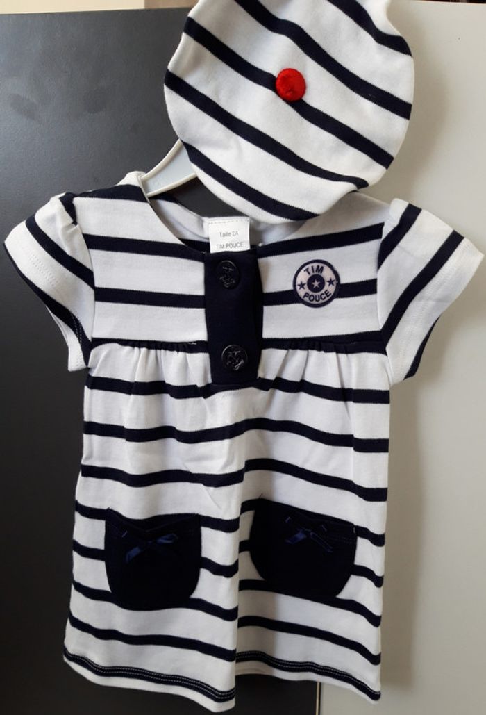 jamais portée, ni le béret. 100 % coton. la couleur est blanc et marine très foncée qui tire vers le noir. Je vend d'autres vêtements de 24 mois et de taille prématuré jusqu'à 5 ans, chaussures de 0 à 27, articles de puériculture, équipement bébé, jouets, poupées... j'accepte aussi le règlement par chèque si vous préférez ne pas payer en ligne