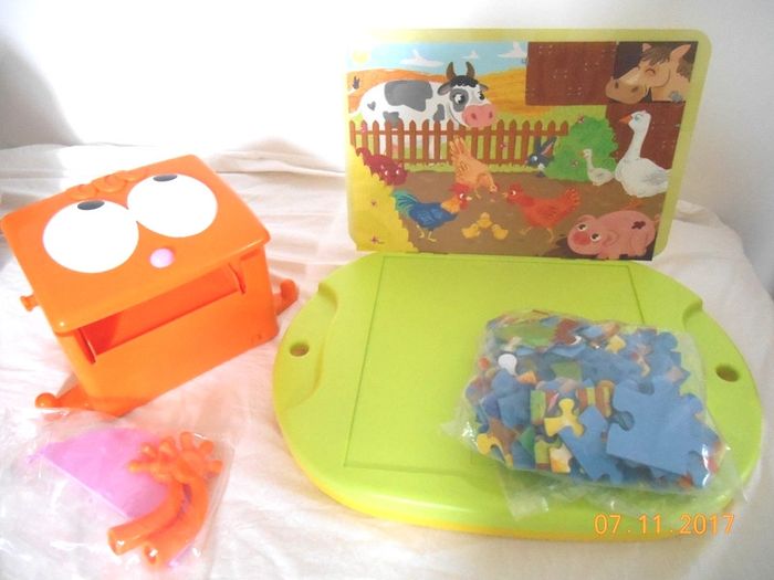 Grâce à Puzzli, l'enfant est accompagné pour faire son puzzle. Il distribue les pièces et donne des conseils à l'enfant. Le plateau recto-verso permet à l'enfant de faire facilement son puzzle - un côté pour les puzzles de 12 et 24 pièces - un côté pour les 49 pièces. Le porte-poster intégré au plateau permet à l'enfant de garder l'image de son puzzle devant lui. dans sa boite d'origine fonctionne avec 2 piles LR6 - AA, non fournies ouvert mais n'a pas servi car n'a pas plu Je vend d'autres jouets, poupées, vêtements de taille prématuré jusqu'à 4 ans, chaussures de 0 à 25,   articles de puériculture, équipement bébé... j'accepte aussi le règlement par chèque si vous préférez ne pas payer en ligne