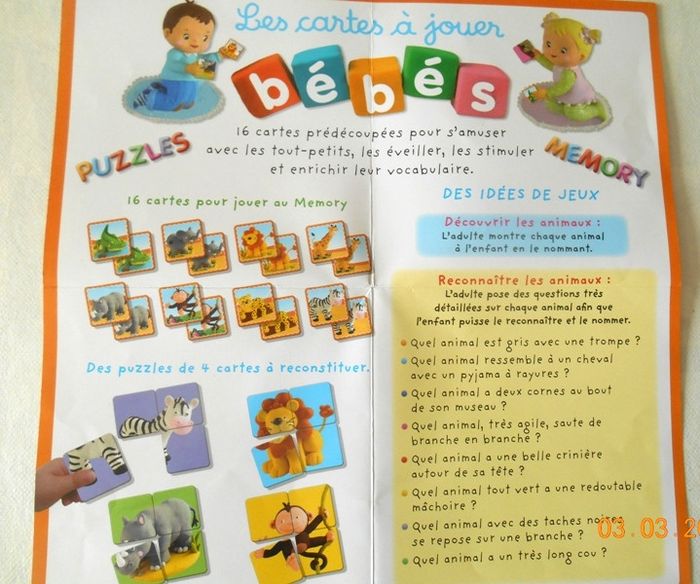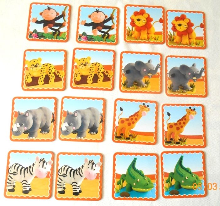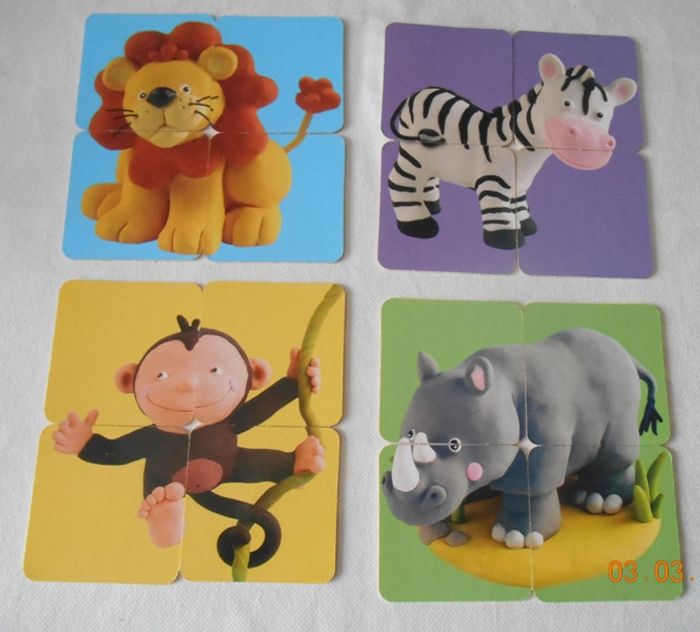 Jeu 2 en 1 Puzzle 4 animaux/ Memory 8 animaux / carton 1 face, 1 animal de 4 pieces à reconstituer, l'autre face est un jeu de mémo de 8 animaux (16 cartes ), comme neuf Je vend d'autres puzzles, jouets, poupées, vêtements de taille prématuré jusqu'à 4 ans, chaussures de 0 à 25,   articles de puériculture, équipement bébé... j'accepte aussi le règlement par chèque si vous préférez ne pas payer en ligne