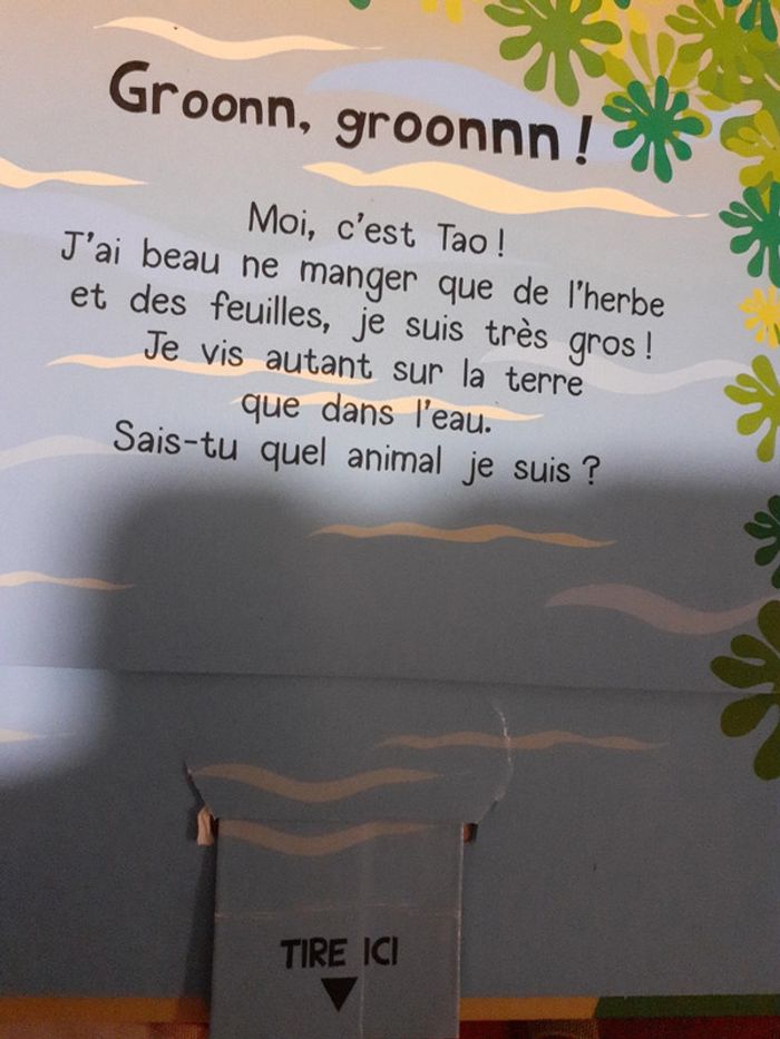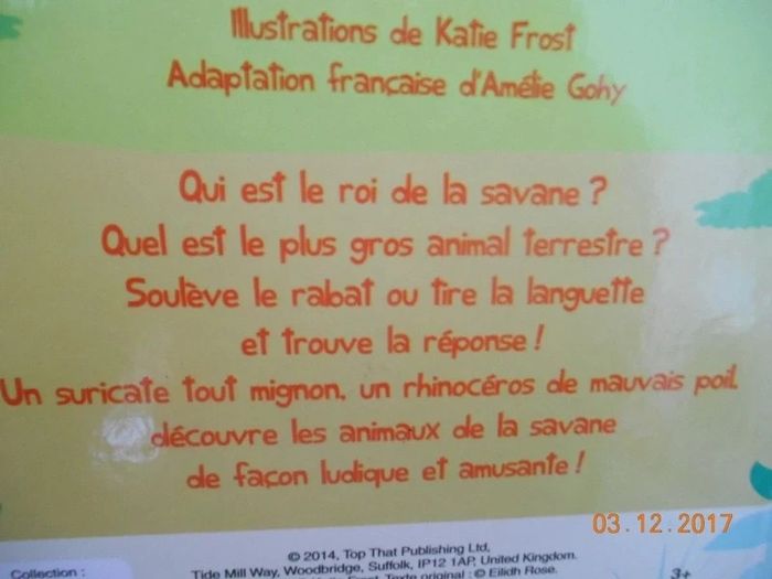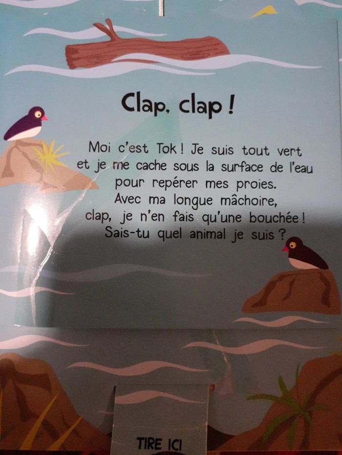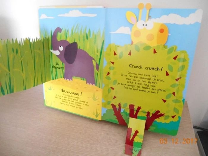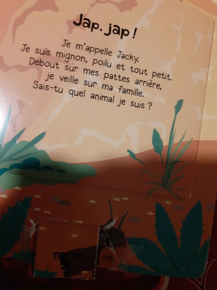 edition HEMMA Qui retombe toujours sur ses pattes ? Qui adore se rouler dans la boue ? A chaque page, une devinette! L'enfant va découvrir l'animal caché en soulevant le volet ou en tirant sur la languette. Une façon ludique et amusante de découvrir les animaux de la ferme. Vous pouvez voir sur les images que le dessous des tirettes est abîmé. Le mecanisme du suricate ne fonctionne plus, une image a été abimée, vu à l'image