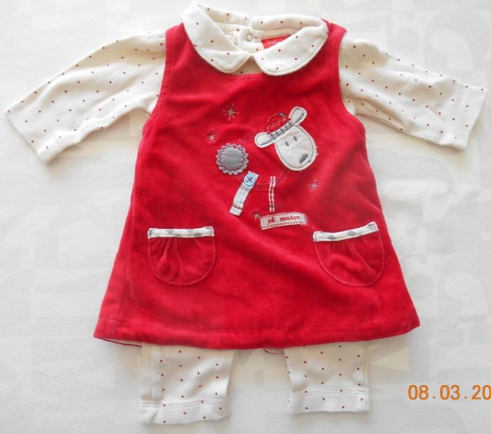 Le body n'a jamais été porté mais la robe oui. il y a une légère tache jaune à l interieur de la robe fermeture à pressions dans le dos de la robe et du body Je vend d autres vêtements de 1 mois et de préma jusqu a 4 ans, articles de puericultures, équipement bébé, chaussures de 0 à 25, jouets, poupées...