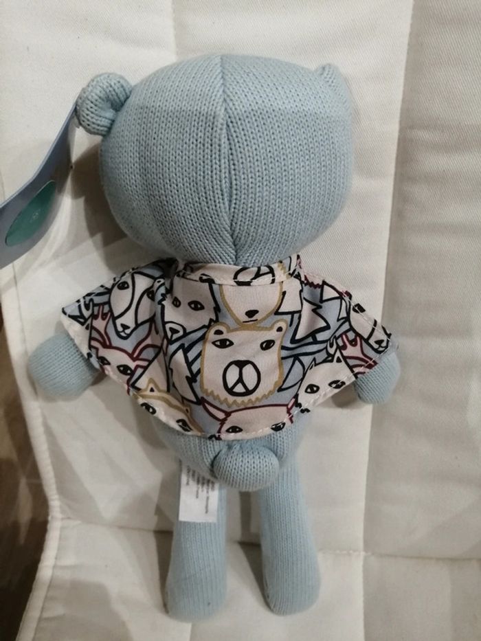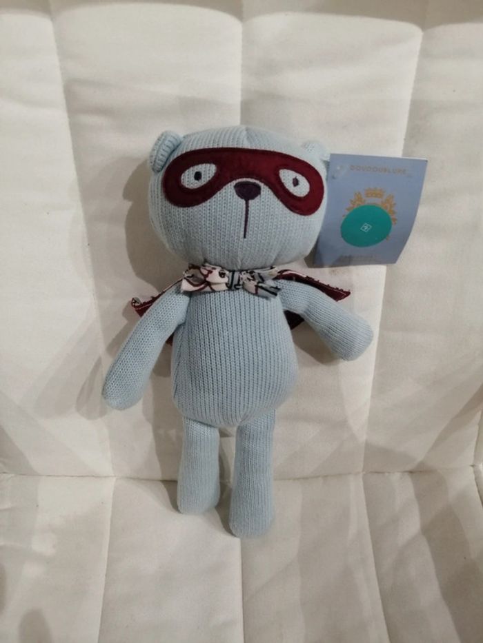 Peluche ours masqué monoprix Bleu laine cape bordeaux 30 CM