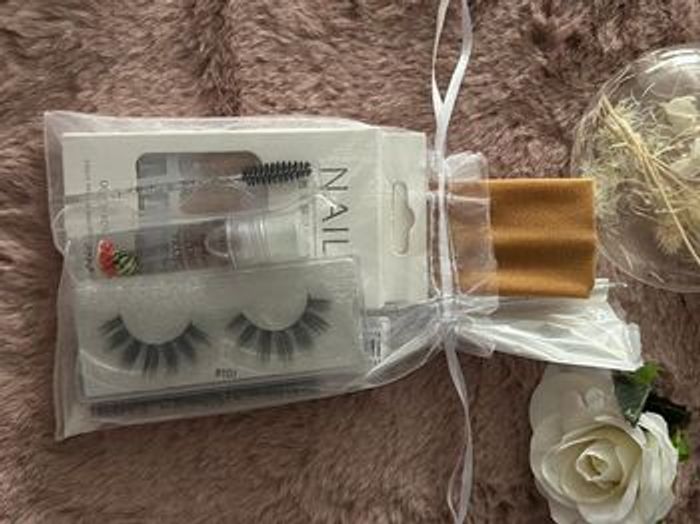 Ce lot est composé de: Une bonne a faux ongle Une paire a faux cils Un gloss Une peigne plaquant Un bandeau Une brosse à faux cils