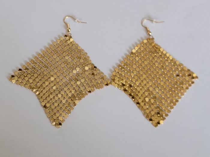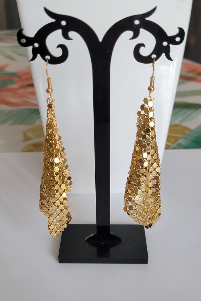 BOUCLES D'OREILLES STYLE EFFET DRAPE COLORIS DORE ! 1 jolie paire de boucles d'oreilles longues . Coloris DORE. tres leger à porter. Dimensions: Hauteur totale: 6,5 cms . N'hésitez pas à regarder mes autres ventes. Produit neuf sous emballage ! Envoi rapide et soigné