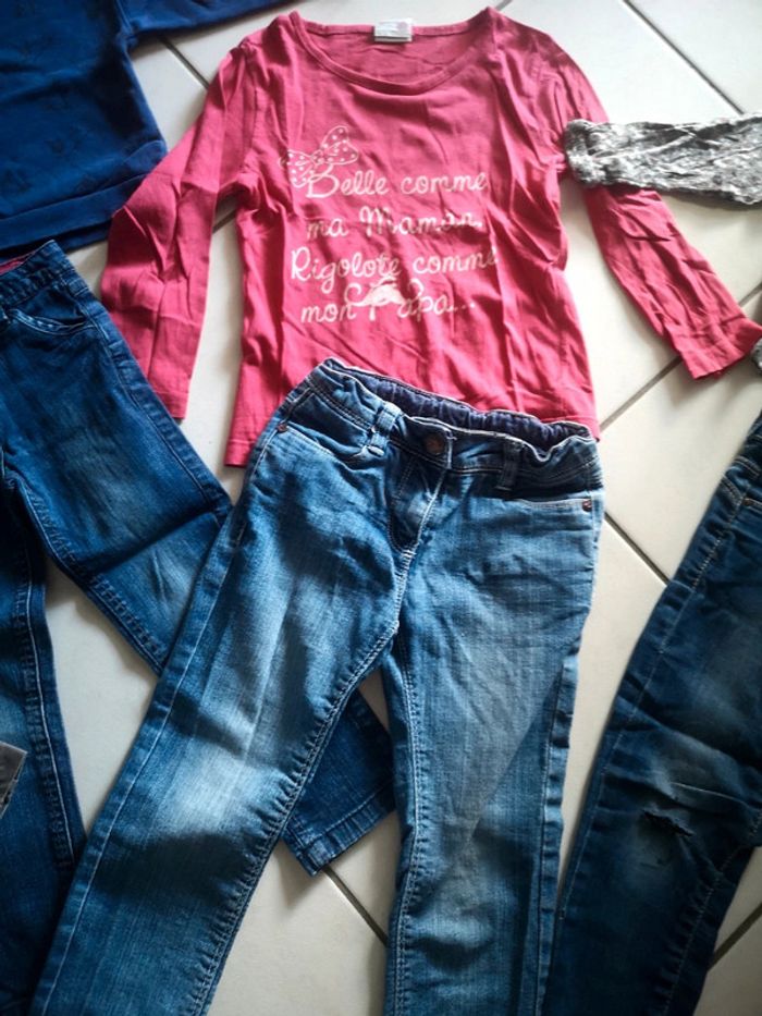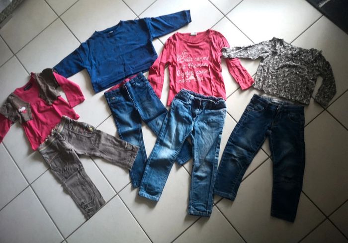 bon état 4 pantalons dont 1 usé aux genoux (voir photo) et 4 hauts Diverses marques