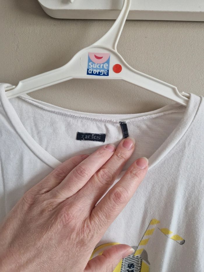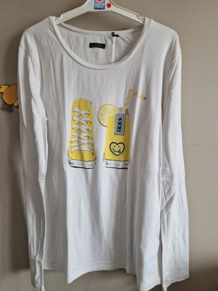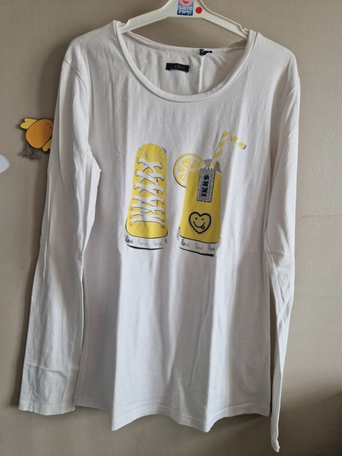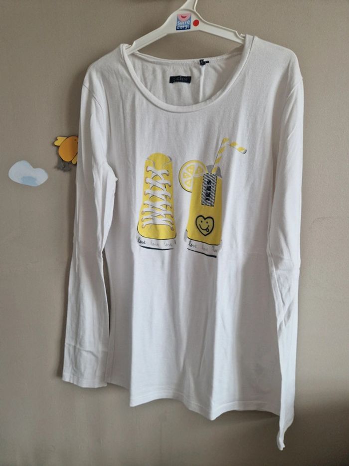 Haut/ tee-shirt manches longues, motifs baskets/ citron, taille 14 ans (156 cm), de marque IKKS. 46% coton, 46% modal et 8% élasthanne. Pas mal porté mais reste correct. 1 petite tâche sur le bout d'une manche (cf. dernière photo) que j'ai dû à prendre en photo. #fille14ansgain_de_place #fille12ansgain_de_place