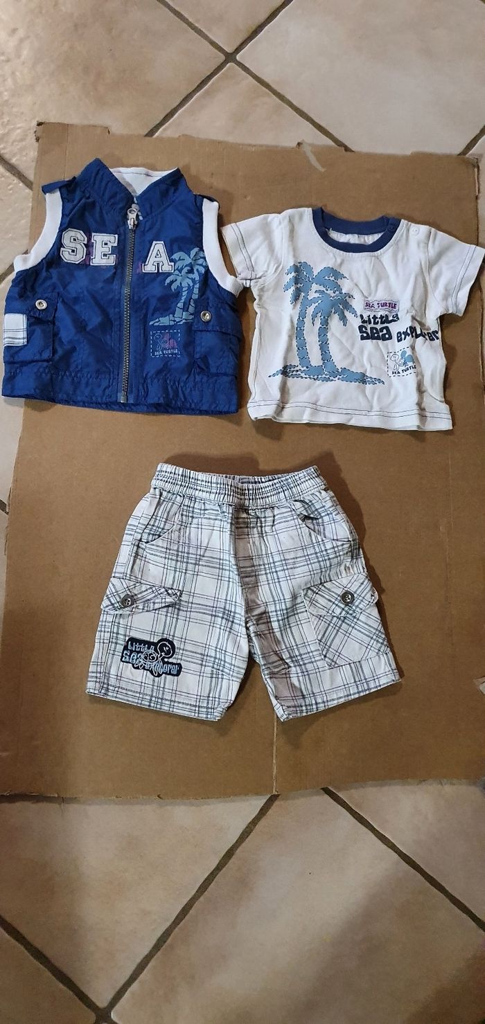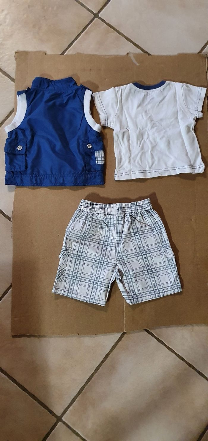 Ensemble comprenant un blouson sans manche, un short ceinture élastique, un tee shirt avec boutons sur l'épaule. Taille 12 mois. Très bon état. Marque Tom et kiddy.