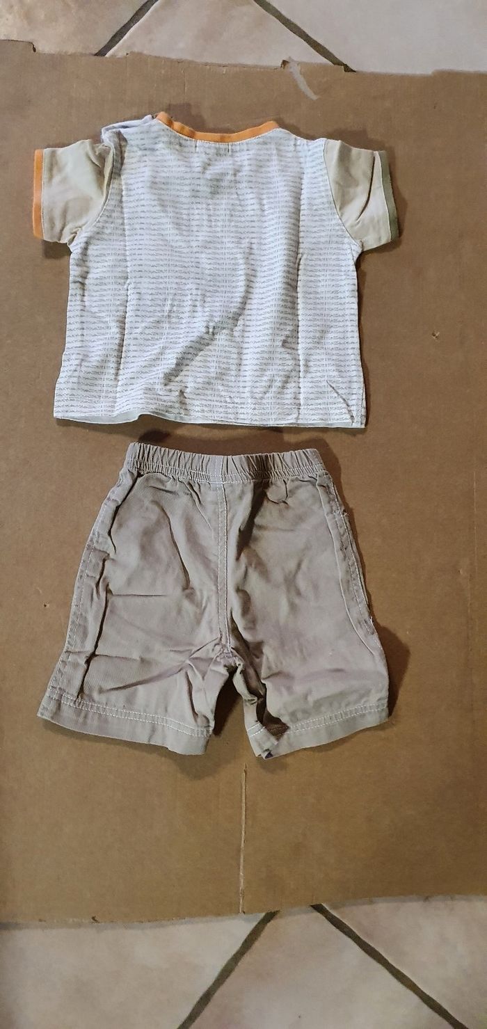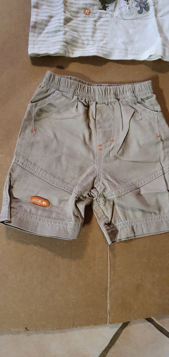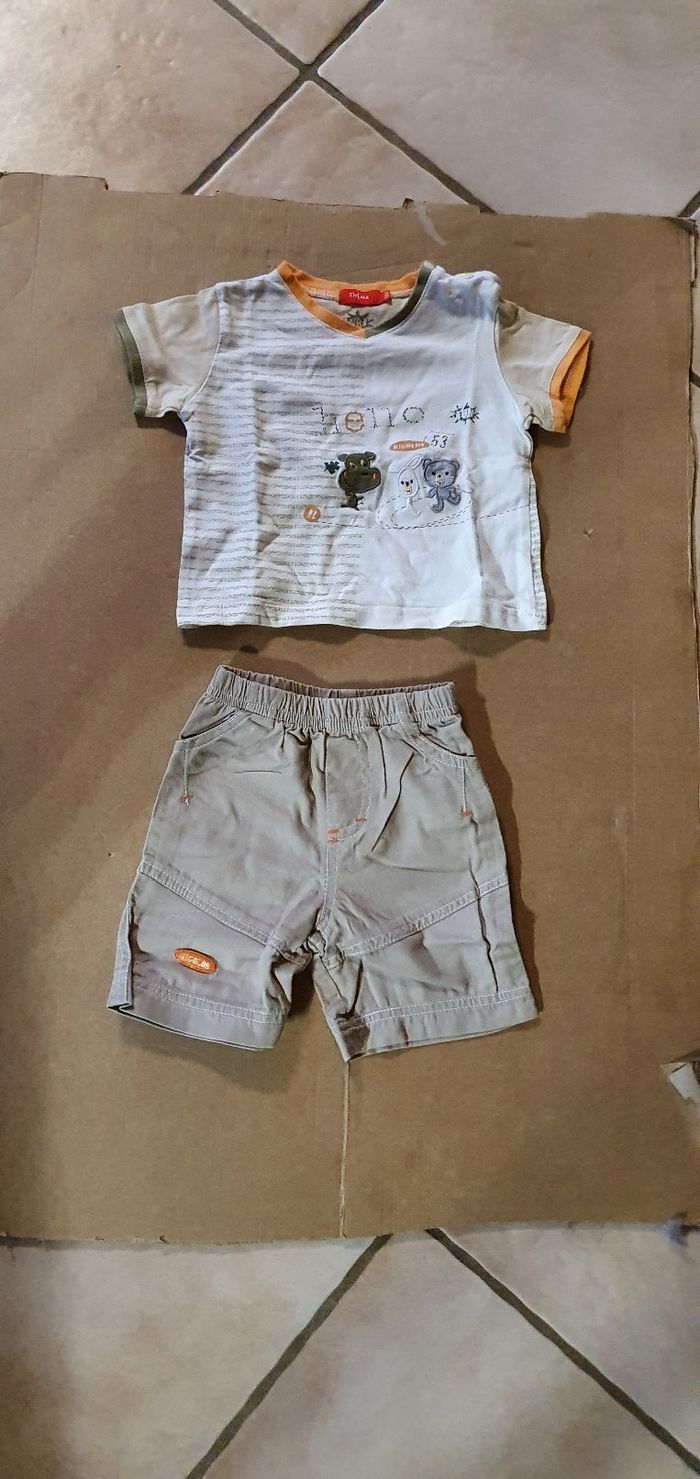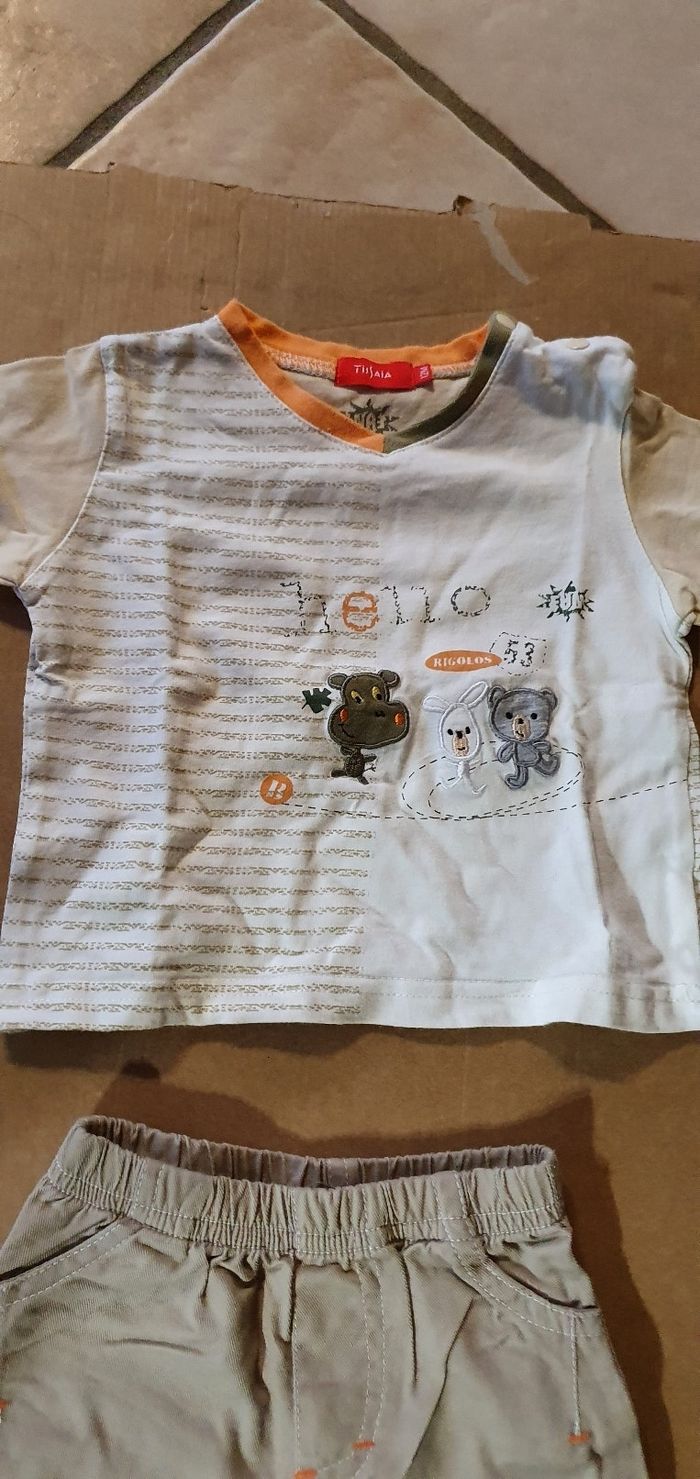 Ensemble comprenant un tee shirt avec pressions sur l'épaule et un short avec ceinture élastique. Très bon état. Marque tissaia. Taille 12 mois.