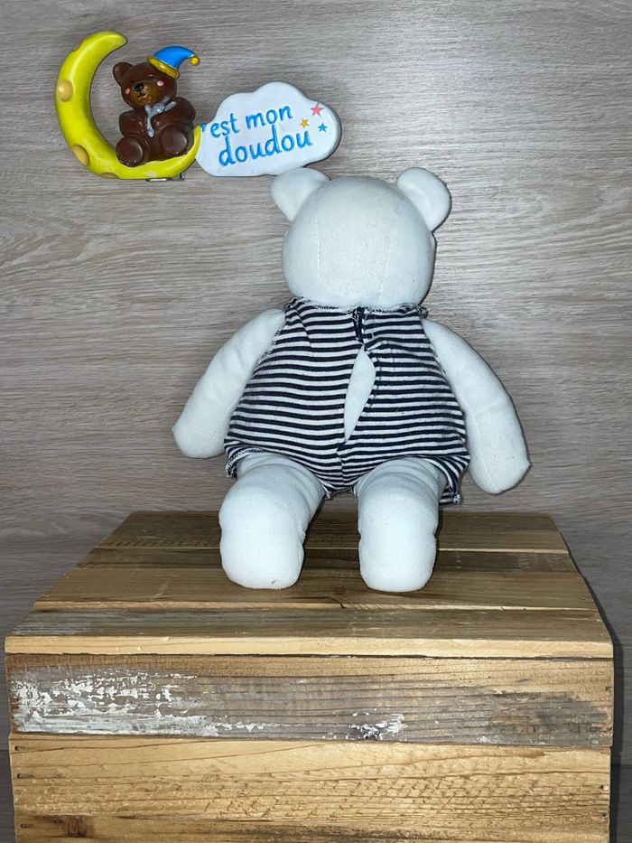 🌺 Bonjour, vendeuse professionnelle 🌺 Je vous propose le Doudou suivant : Marque : Sucre d’orge Genre : ours Format : peluche Mesure : 24cm Coloris : blanc, salopette rayée État d’occasion : très bon Stock : 1 RÉFÉRENCE : SDO181 ➡️ Pour plus de modèles de cette marque, cliquez ici : #sucredorge_cestmondoudou ⭐️ La décoration (boîte...) n'est pas vendu avec le doudou ⭐️