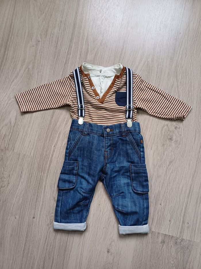 Ensemble Obaïbi, taille 6 mois, porté 1 fois. Jeans, t-shirt manches longues et gilet à capuche. Le tout en parfait état.