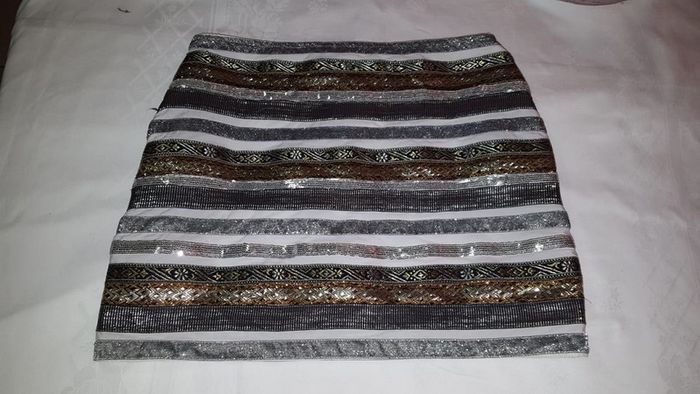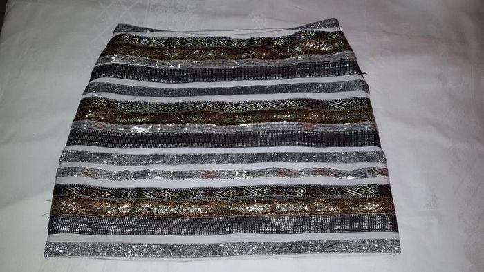 Jamais portée elle est blanche avec des rayures argentée séquins et dorée Doublée 100 % polyester