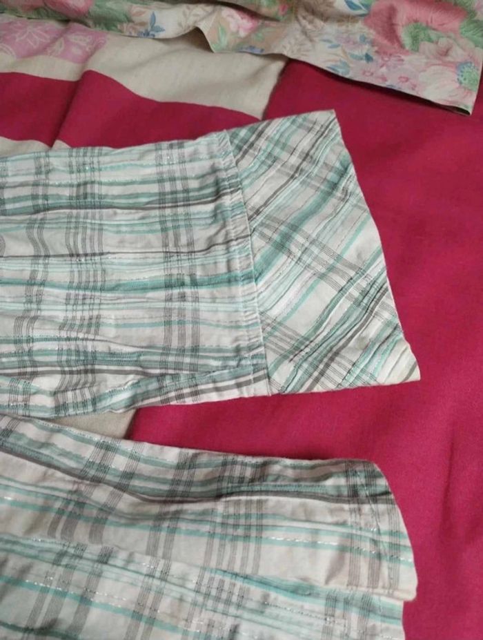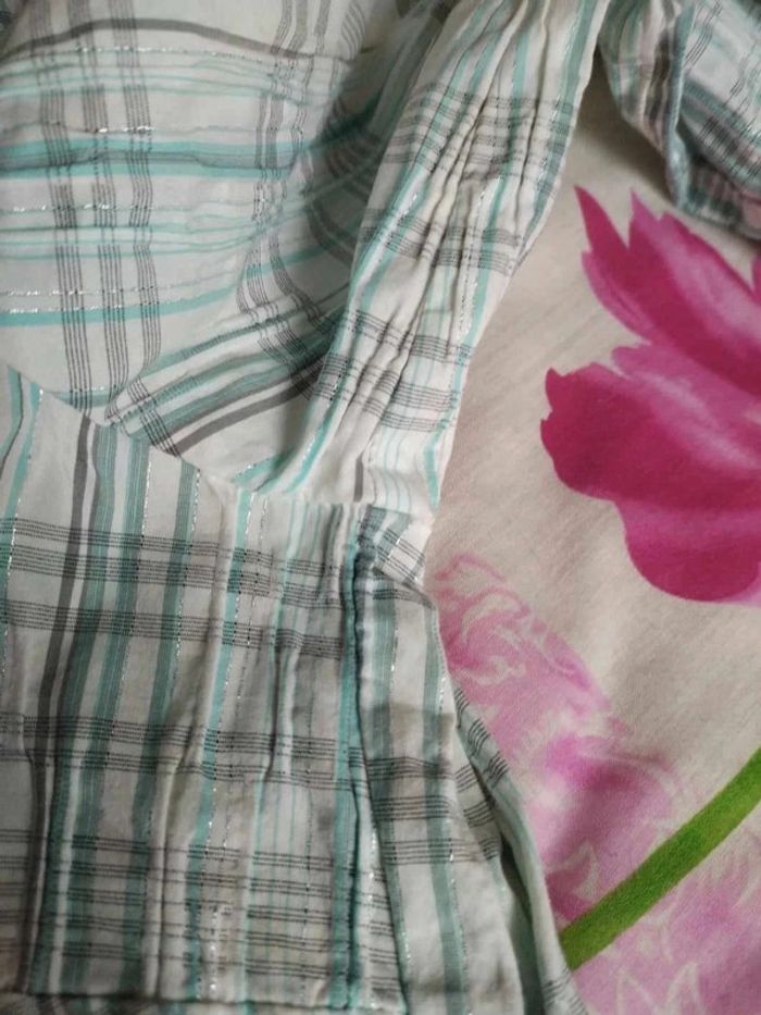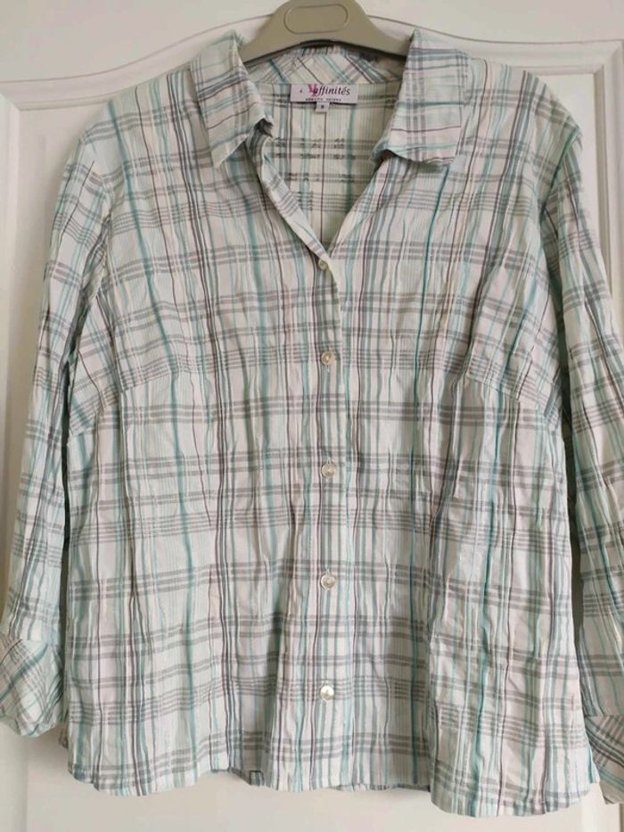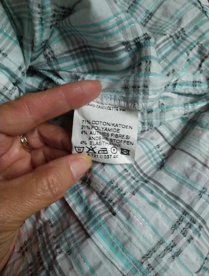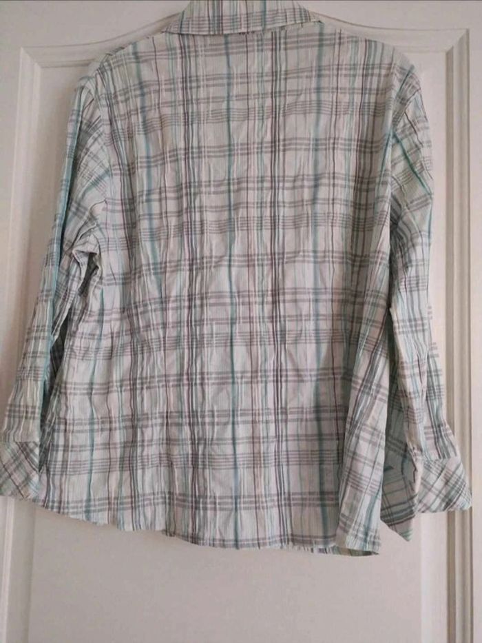 A été porté mais reste en très bon état pas de tâche ni de trou. Tous les boutons sont OK Hauteur 60 cm largeur aisselles à aisselles 52 cm Tissus aspect froissé avec un fil argenté