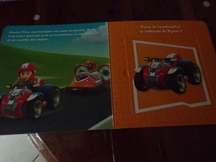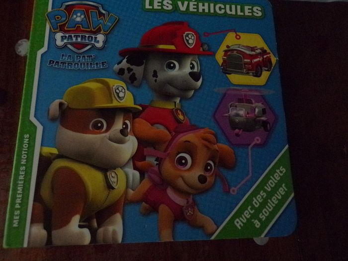 Livre à volets La Pat Patrouille les véhicules Sur la couverture sur le coté en haut a peine déchirer Les coins du livre a peine abimer