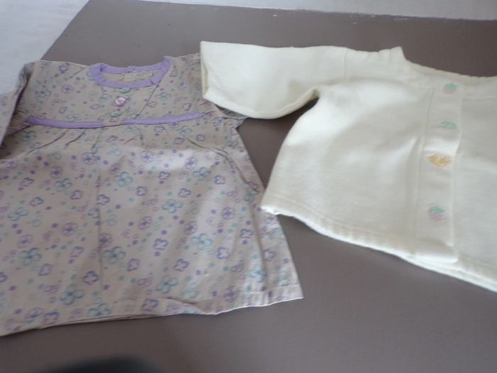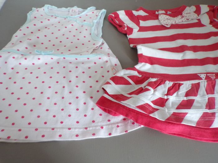 Lot de 16 vetements 6 mois Sergentmajor,Sucre d'orge,Kitchoun, Obaibi, Charlotte aux fraises 1 Robe sans manches Sucre d'orge, 1 robe manches courte Sergentmajor , 1 robe manches longues+3 bodys manches courte ouverture devant Kitchoun +2 Ensembles Obaibi,+Tee shirt manches longues+1 Barboteuse+1 Combishort+1 Robe en jeans a bretelles Obaibi,1 Short a rayures+1 Pyjama en velours rose+ 1Glet+1Legging