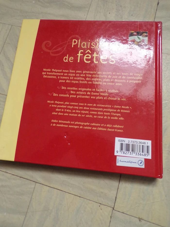 Livre Plaisirs de fetes 60 Recettes Editions Ouest-France Dérrière le livre la couverture au fond un peu piquer