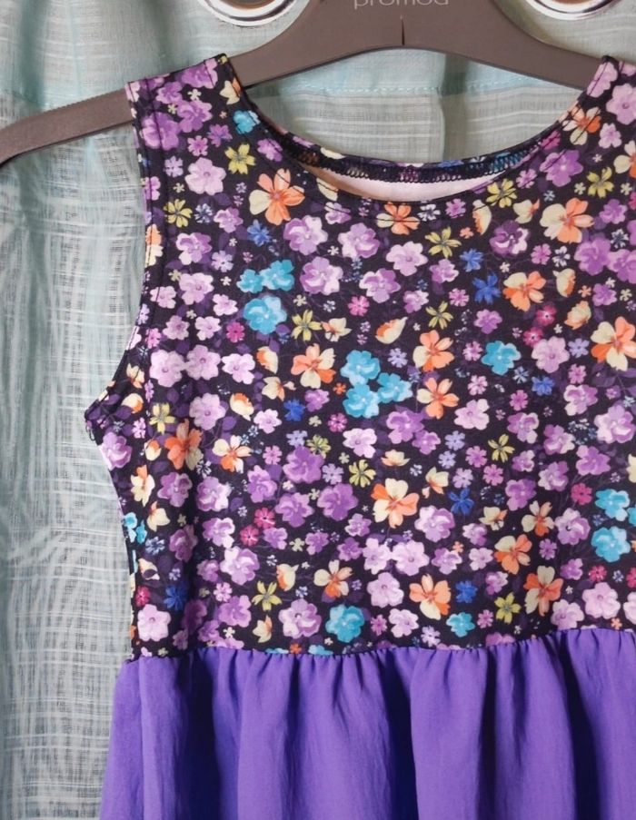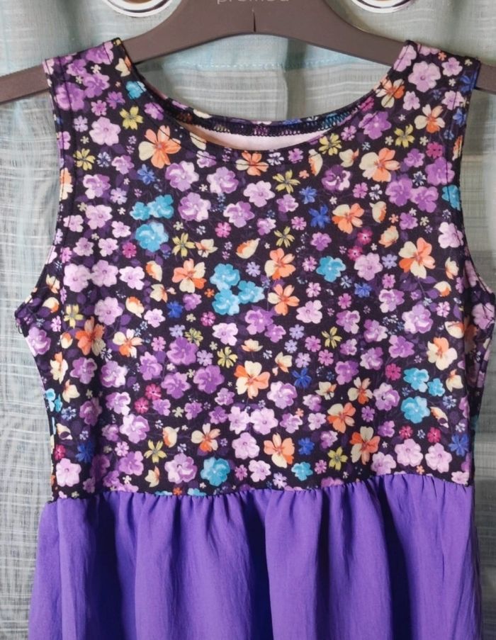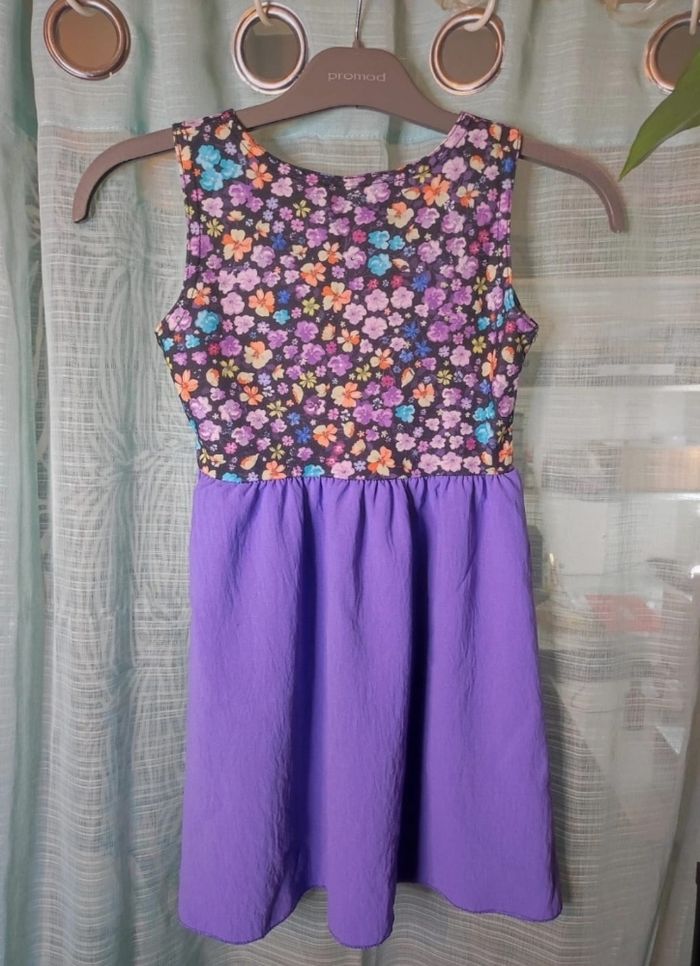 Robe a motif fleurie violette. Matière fluide et légère Acheter cette été et porter 1 fois pour une occasion. En très bonne état Taille 5/6 ans (étiquette manquante)