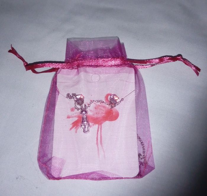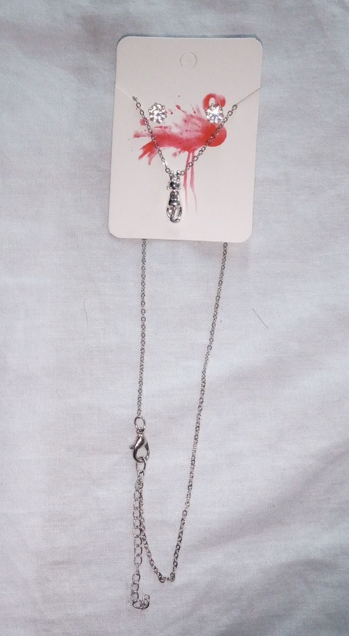 Boucle D'oreilles argentées avec gros strass et collier avec une médaille chat qui s'accroche au collier