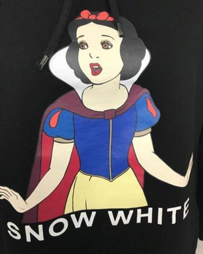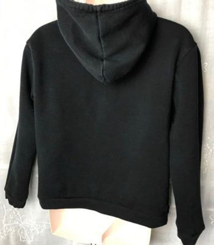 Pull sweat noir à capuche doublée, sérigraphie devant blanche neige taille XS mais convient aussi pour un 36 carrure 47 cm longueur manches 52,2 cm largeur à plat sous les bras 50 cm longueur 56,8 cm majoritairement coton, plus d’étiquette Disney