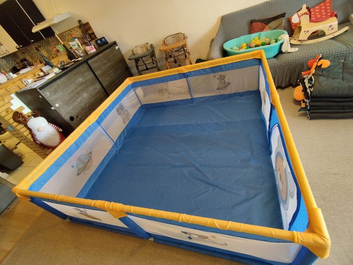 Parc enfant 2Mx2M. Bon etat. Ideal pour nounou ou jumeaux. Le parc présente deux défauts: -une déchirure au niveau du sol d'environ 15 cm. -deux barres légèrement pliées (s'installe au niveau du sol) Les défauts n'empêchent pas l'utilisation normale du parc. Prix neuf :150€ Vendu :75€ Envoie possible.