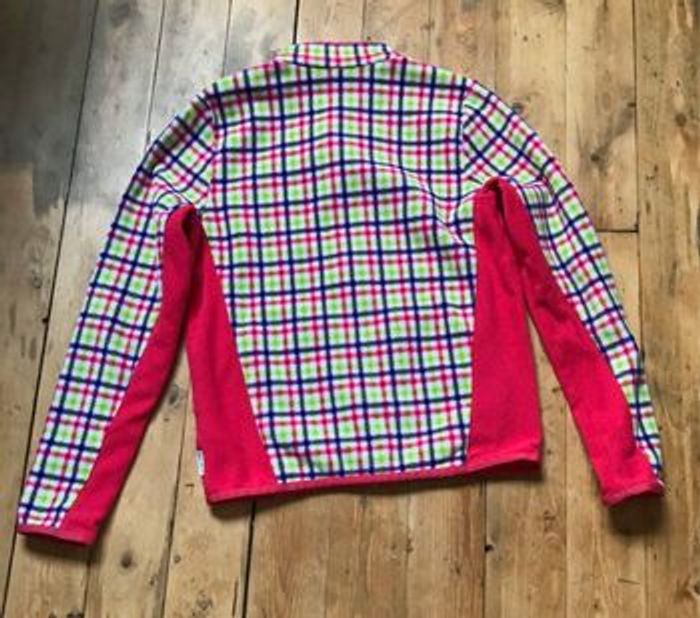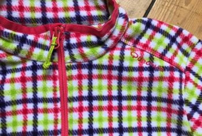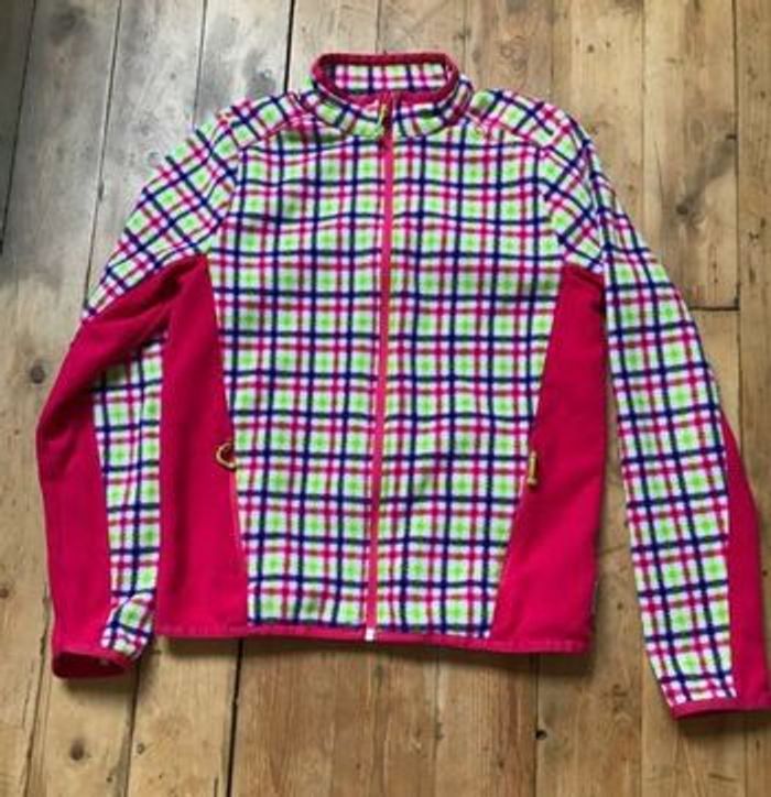 Gilet veste polaire stratermic Rose fuchsia et blanc carreaux vert pomme et violet Entièrement zippée devant 2 poches Taille 14 ans Décathlon Quechua