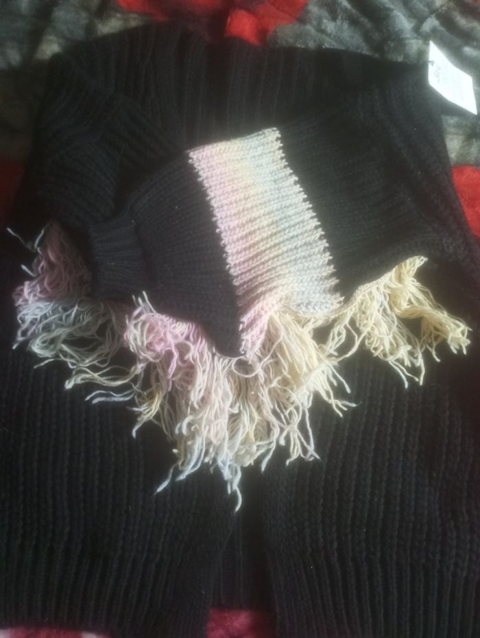 Veste en laine acrylique épaisse noir avec des franges sur les bras de couleur rose et bleu clair ne se ferme pas taille unique jusqu'à un 44/46 neuve avec étiquette