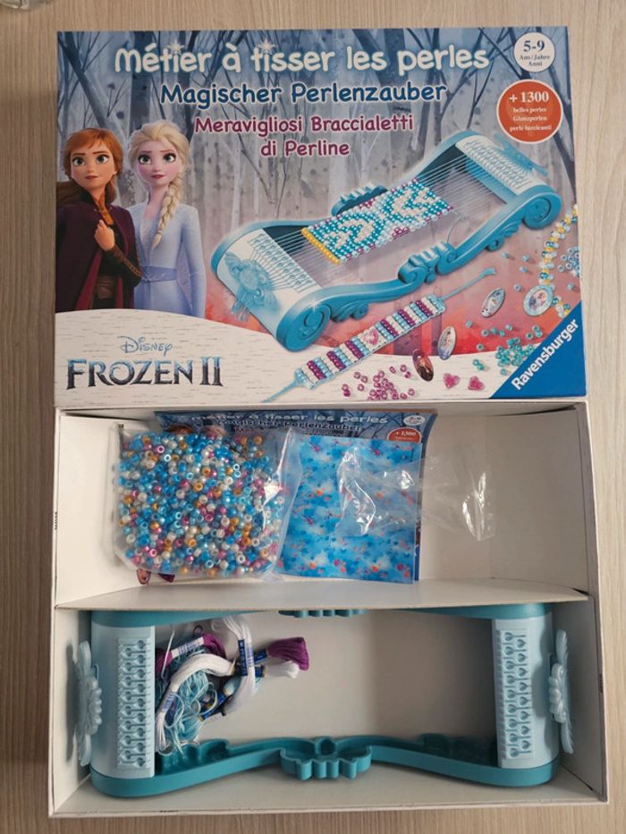Métiers à tisser les perles La Reine des Neiges Ravensburger État neuf, jamais utilisé. Imagine et crée de beaux bracelets et colliers sur le thème de la Reine des Neiges 2 Cest facile de réaliser de superbes bijoux aux couleurs vives. Le métier est simple à installer car il ny a que deux pinces à fixer pour tendre les fils. Après, c\'est facile de tisser grâce aux grosses perles! Des médaillons princesses super stylés pour réaliser ses beaux pendentifs !! Tu es libre dimaginer, de porter ou d\'offrir les bijoux créés! Dès 5 ans Contenu: 1 grand métier solide, 2 pinces de serrage, + 1 300 grosses perles, des médaillons, des échevettes de fil coton, 1 aiguille, 1 notice détaillée qui permet de réaliser les bijoux présentés.