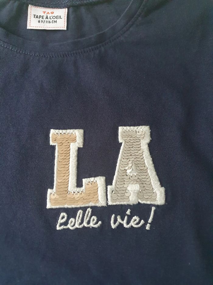T-shirt manches longues bleu marine "LA belle vie !" Tape à l'œil Taille 6 ans En très bon état.