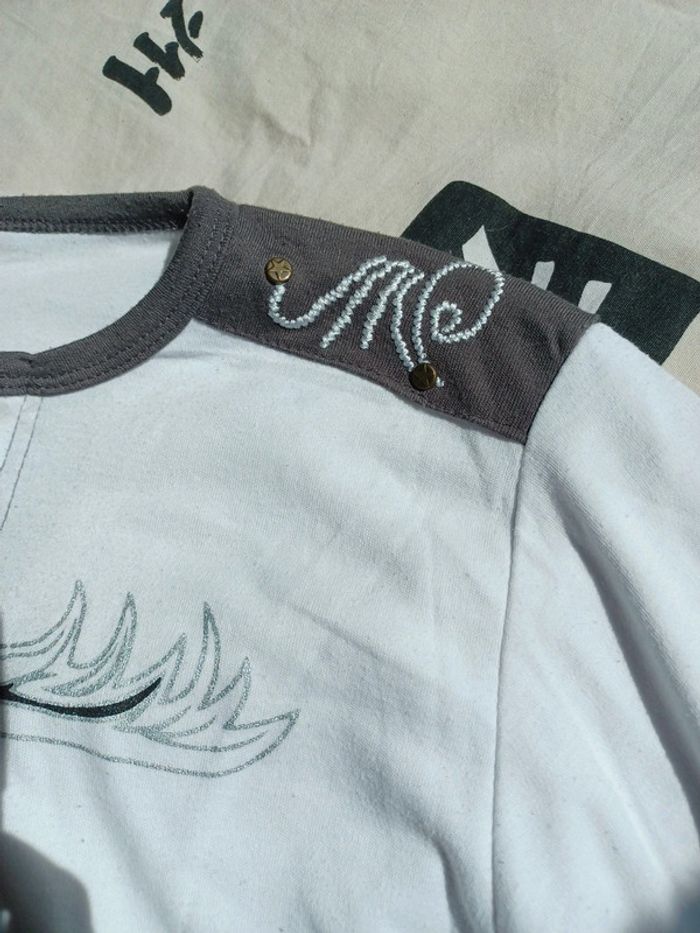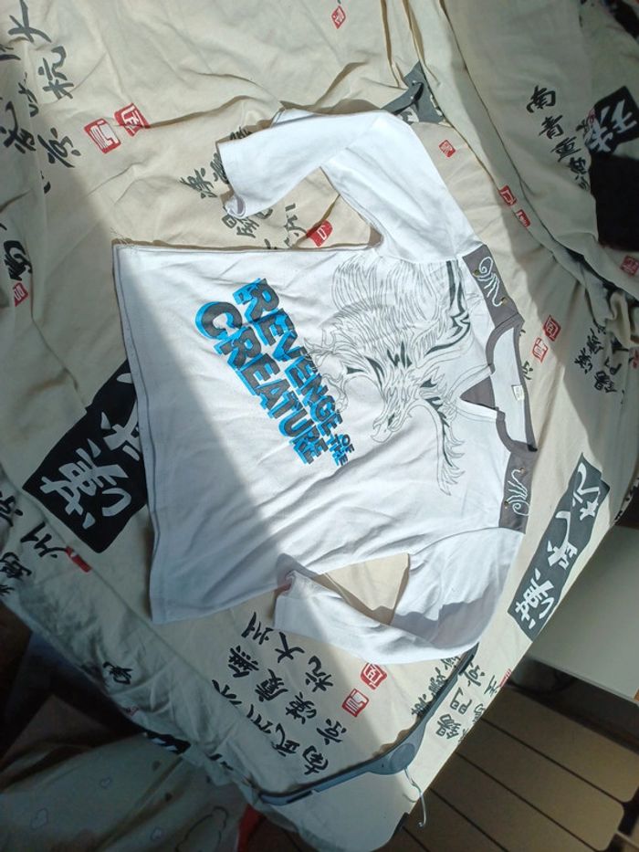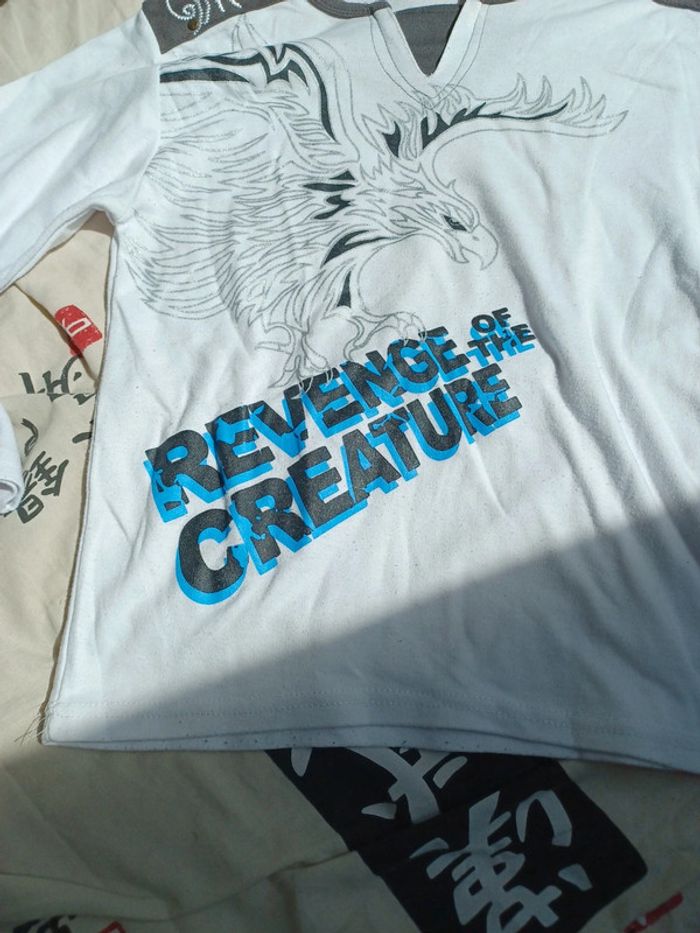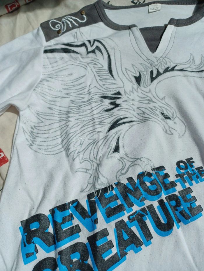 Très beau tee-shirt blanc serigraphié avec un aigle en argent et noir "revenge oh the creature" Fond blanc Épaules agrémentées de clous et de broderies sur fond marron #lae73garcon14ans
