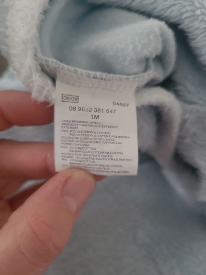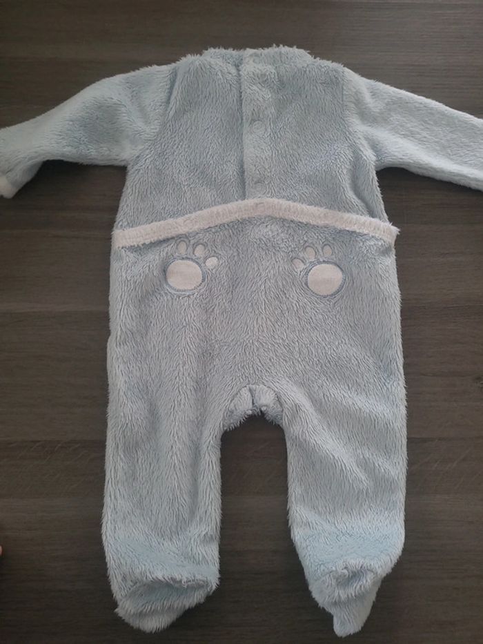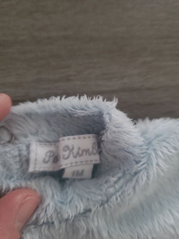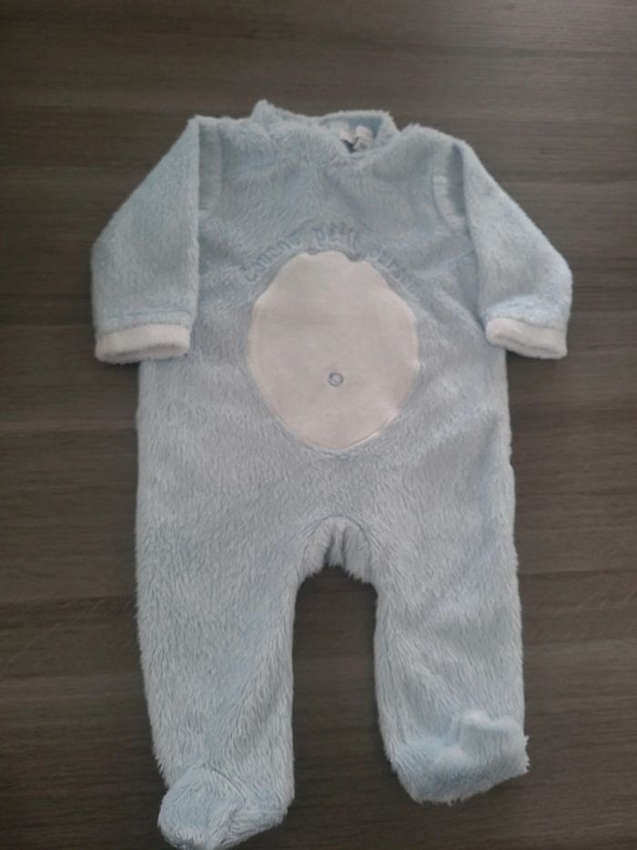 Joli petit pyjama tout doux de la marque petit kimbaloo. De couleurs bleu clair avec un peu de blanc. Se ferme à l'arrière avec des boutons à pression. 🎀 1 mois Matière extérieure: 🎀 100% polyester Doublure: 🎀 100% coton 🎀 petit kimbaloo 🎀 bon état #elodiectr44pyjamabebe1mois