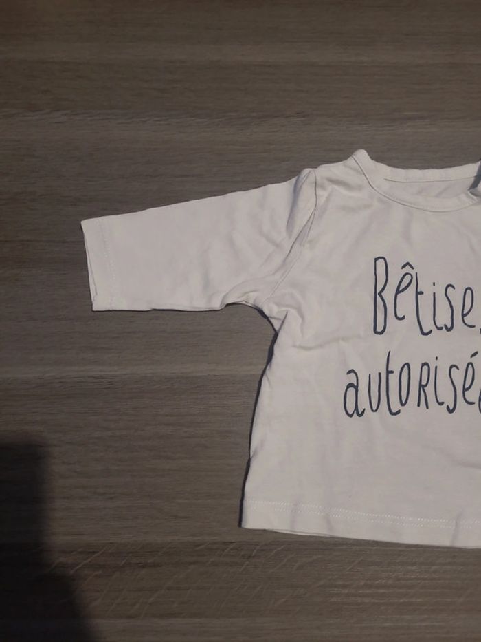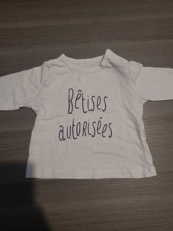 Joli petit Tee-shirt blanc à manches longues avec écrit bêtises autorisées. Il n'y a pas d'étiquette ni de marque ou de taille écrit dessus, mais j'ai comparé avec un Tee-shirt de la marque kiabi et il correspond à un 3 mois. 🎀 3 mois 🎀 bon état #elodiectr44teeshirtbebe3mois