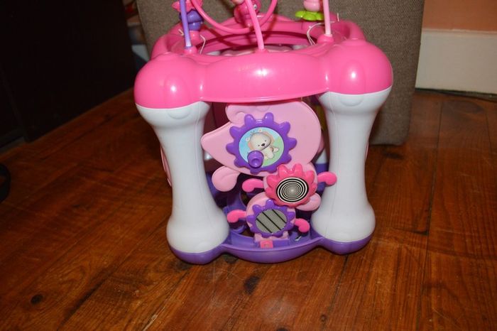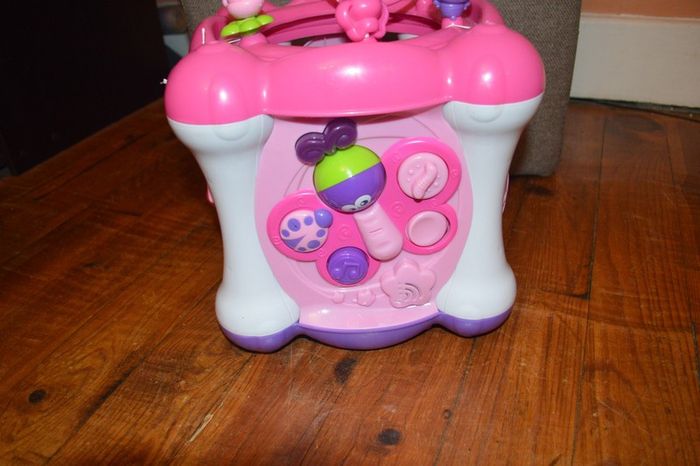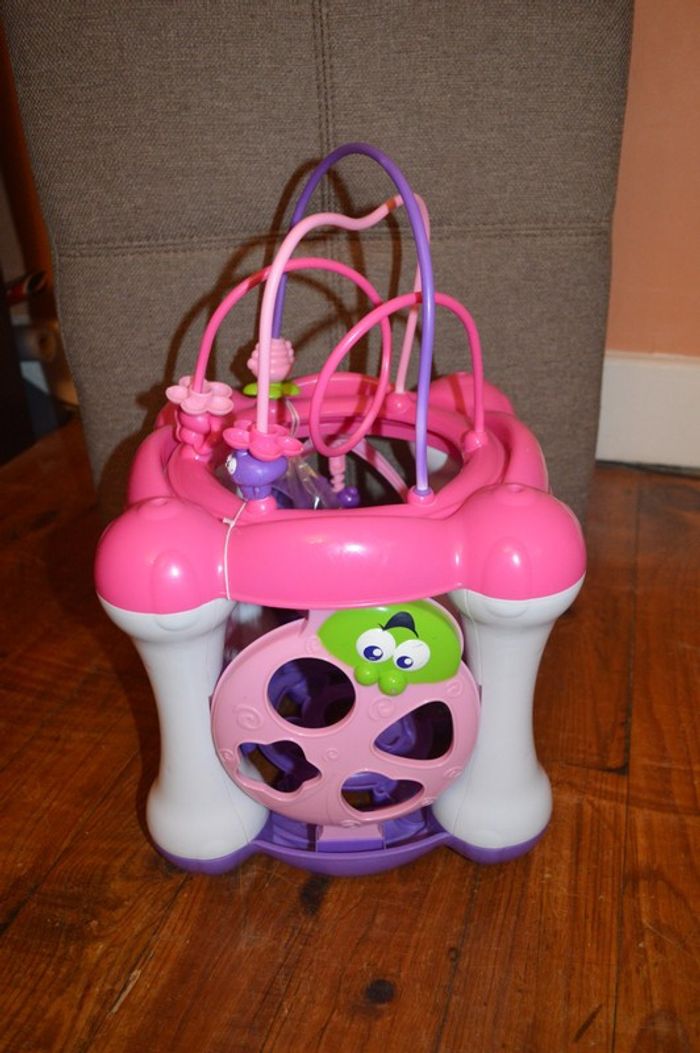 Cube d'éveil 4 faces 1 face avec des formes qui sont présentes 1 face ou l'enfant appuie et cela fait du bruit Hauteur : 26 cm sans le boulier du haut sinon 45 cm Cube en bon état #jeuninie48