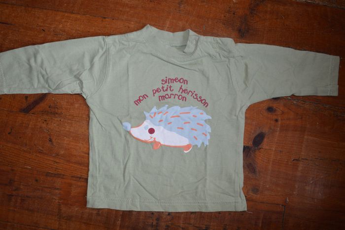 Tee shirt manches longues 6 mois hérisson Sur le devant inscription + dessin Tee shirt en bon état, pas de taches, ni trous #6moisgarconninie48