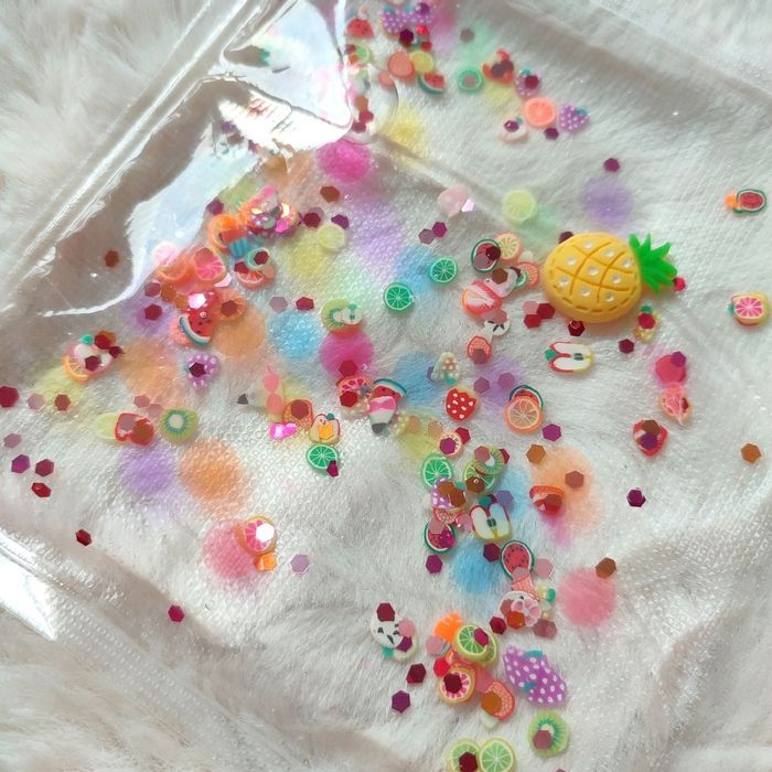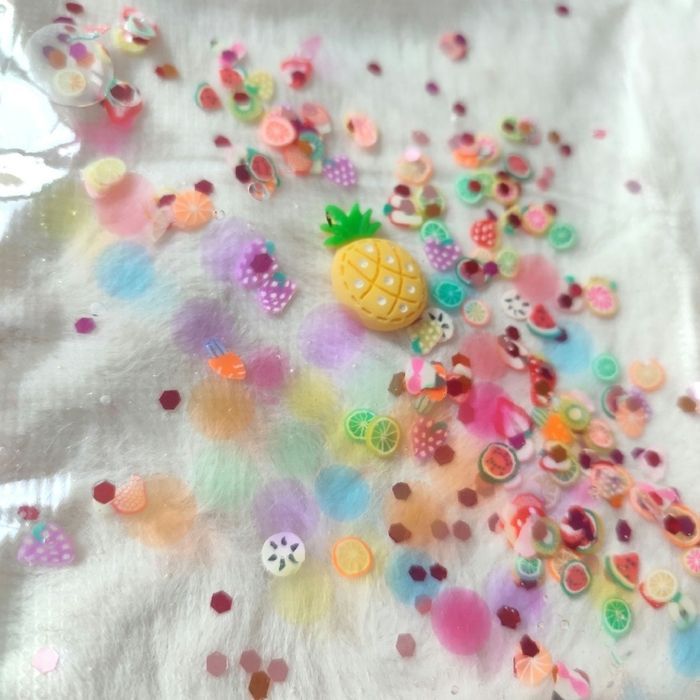 Pochette sensorielle Tutti Frutti 🍍 Contient plein de fruits tranchés 🥝 un gros ananas 🍍 des bulles d'eau 💦 et des paillettes. ✨
