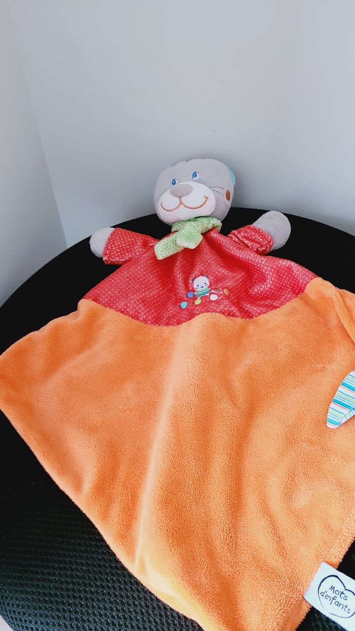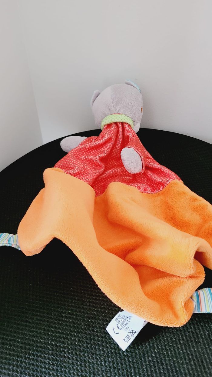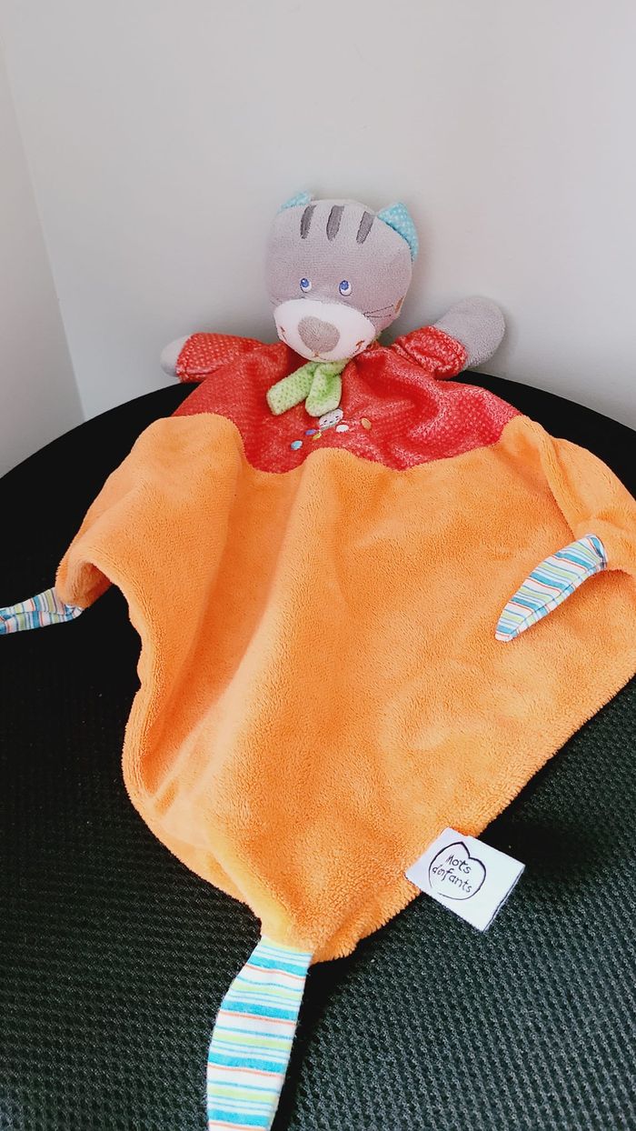 DOUDOU PLAT CHAT MOTS D'ENFANTS LOSANGE ORANGE ROUGE FOULARD VERT LECLERC 141