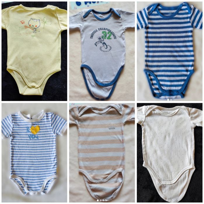 Lot de 6 bodies manches courtes 6 mois pour l'été. Les boutons pressions de l'un des bodies ne sont plus d'origine et ont été changés. Vêtements disponibles également à l'unité dans mon dressing. Plus d'infos sur demande ou en regardant les annonces individuelles.