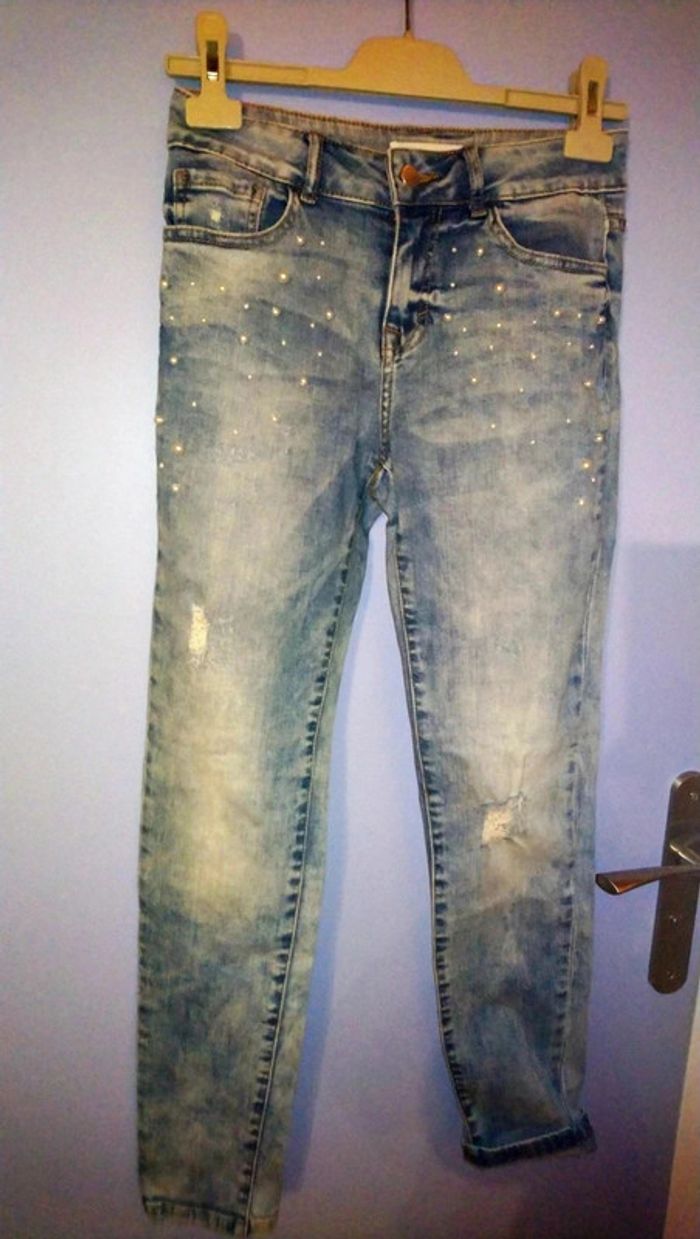 Superbe jeans à perles cache cache taille 36 aspect used comme neuf - photo numéro 1